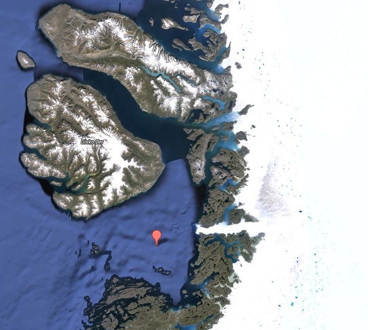 Disko Bay, showing Disko Island and the Nussuaq Pennisula to the north and the Greenland Ice Sheet to the east. The major ice stream draining the Greeland Ice Sheet into Disko Bay is the Jacobshavn Glacier. The blue spots on the Ice Sheet are summer meltwater lakes, which periodically drain to the base of the ice sheet facilitating its movement toward to sea.